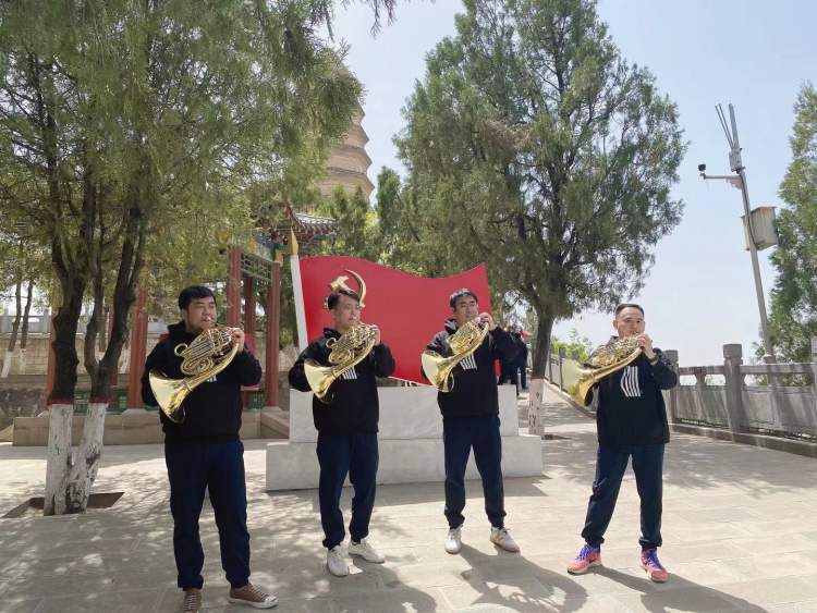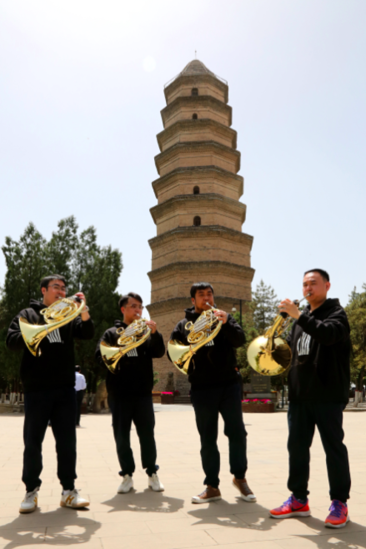 5月6日上午,上海交响四位圆号演奏家郭忠宝、施洁亮、刘闯及钟卓宁拿起乐器,在延安宝塔山上深情吹响一曲《我和我的祖国》,嘹亮号声,万丈豪情,久久回荡,也引得不少游客驻足聆听。
