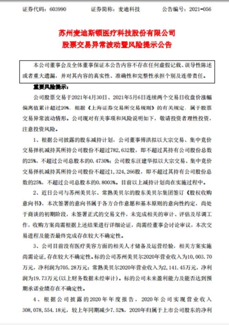 就在前一天,即5月5日晚,麦迪科技公告,公司拟以现金收购美贝尔集团持有的苏州美贝尔美容医院与常熟瑞丽美贝尔医院各不少于80%的股权,标的公司100%股权初步整体估值合计暂定为2.9亿元,比标的资产截至2020年底净资产溢价9.7倍。受此影响,5月6日其股价一字涨停。不过上一交易日(4月30日),有部分资金提前介入,麦迪科技股票已放量涨停,且此前一段时间股价稳步上涨。