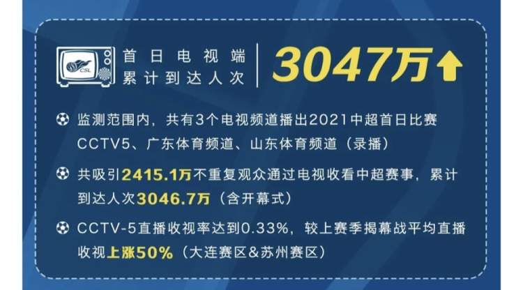 别看中国男足成绩烂,但不影响市场对男足市场的投入。本赛季中超球迷收视率出现大幅提升,仅首轮直播收视率就上涨了50%,一共吸引2415.1万人次通过电视观看比赛。