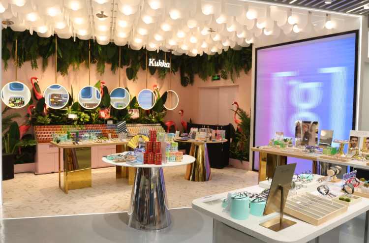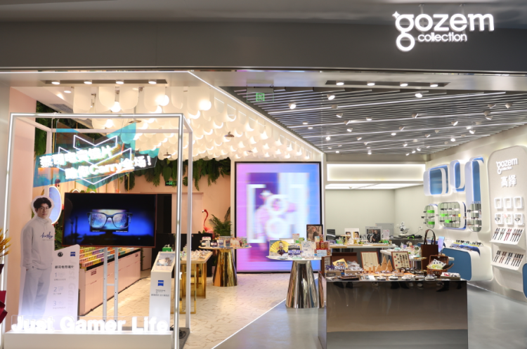 门头上挂着“gozem collection”字样的招牌;左侧的宣传位上摆着IG电子竞技俱乐部选手的人形立牌;稍往里一些的隐形眼镜区域里,粉色的火烈鸟模型昂首挺胸站在角落里;色彩缤纷的手表一字排开,无论是造型还是配色都让人耳目一新;店里最热销的一款墨镜镜架上,印着明显的“中国造”三个字……