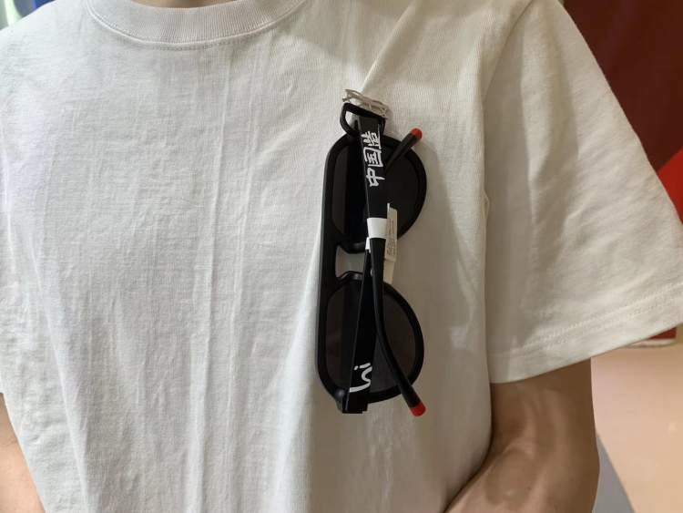 图上这枚眼镜形状的胸针也自带特别的“小心机”,别在胸前时还能充当墨镜架,习惯把墨镜挂在胸前的小伙伴可再也不用担心频繁拉扯到T恤领口啦。