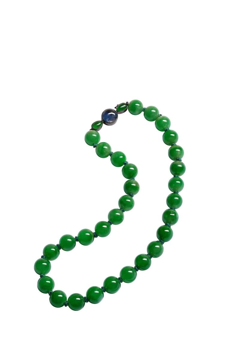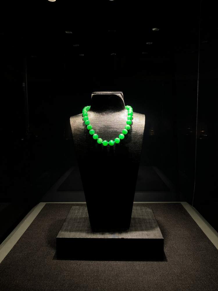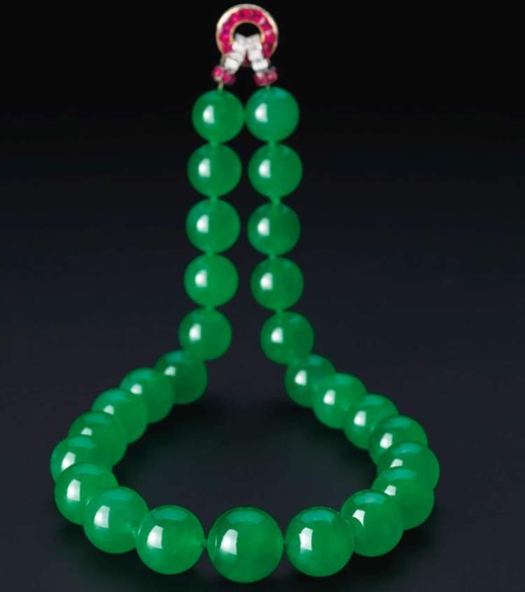 “黄仲涵项链”的主体由30颗翡翠圆珠组成,珠径为13.29-13.43mm。此物原为朝珠,系清宫养心殿旧藏,民国初年经溥仪之手流出紫禁城外,被北京著名翡翠玉石商人铁宝亭购得并改制成项链,随后由南洋富商黄仲涵带往异乡赠予其爱女,后被黄仲涵的孙媳佛姬儿·夏珍藏,在其家族流传近百年。