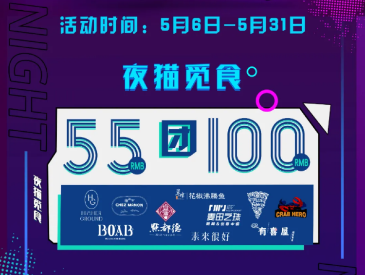 夜猫子觅食看这里哦!从5月6日起至5月31日,上海环宇荟特别推出了“夜猫觅食55团100”的特别活动,每日限购2张,可以在包括点都德、有喜屋、翠蝶等门店的工作日晚市8点以后使用哈~