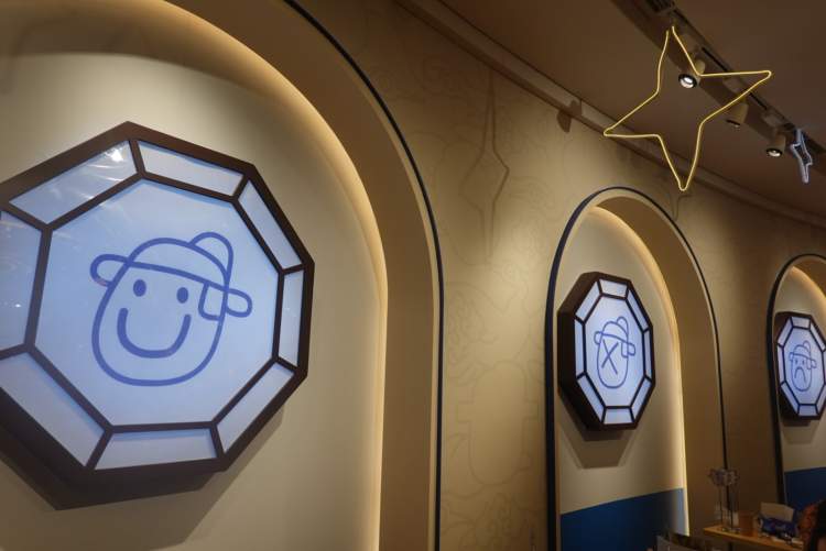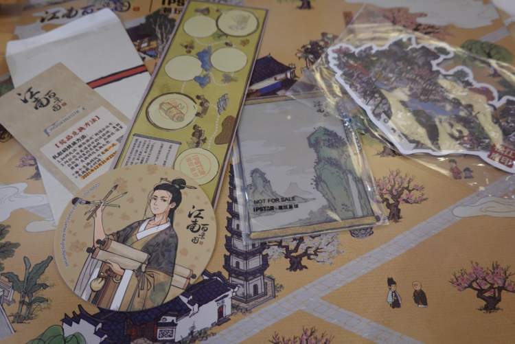 而当你到了店门,会发现这家漫咖在画风上并没有依循游戏中的“古风”,而是浓浓的“漫改风”。蓝色基调,风格明快,一边是“吃点什么呢”的餐饮区,一边是充斥着金画轴抱枕、“采花大盗”徽章等小玩意的周边区。让画卷中的江南走进现代,可爱是不可或缺的。