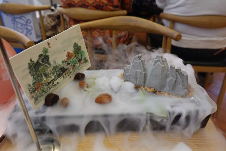 还有当店限定的“豫园仙山”,几乎是每桌必点。它的本质是一个黑芝麻蛋糕,配上一些巧克力制作的“道具”和“幕布”。端上桌时,仙气飘飘,经久不散。口感上,有点像曾在全家热销的“水泥冰淇淋”,也有一些顾客反映“太甜了”。