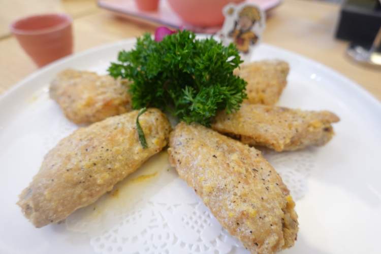 “全家的希望”则是咸蛋黄鸡翅,咸蛋黄系列的食物总归是香的,可惜肉质稍稍有一点柴。人物立牌是“可爱的废物”“妈妈的好大儿”马文才,角色设定是不太擅长工作,擅长躺着,一度可爱到“出圈”。