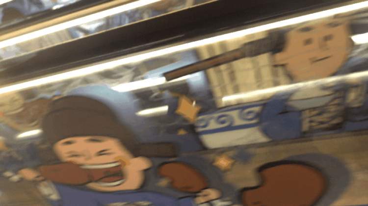 不止进门处,整个商场都被严大人的各种表情包“承包”了。连接一楼和二楼的自动扶梯有各种各样的严大人,微笑的微笑,啃鸡腿的啃鸡腿。