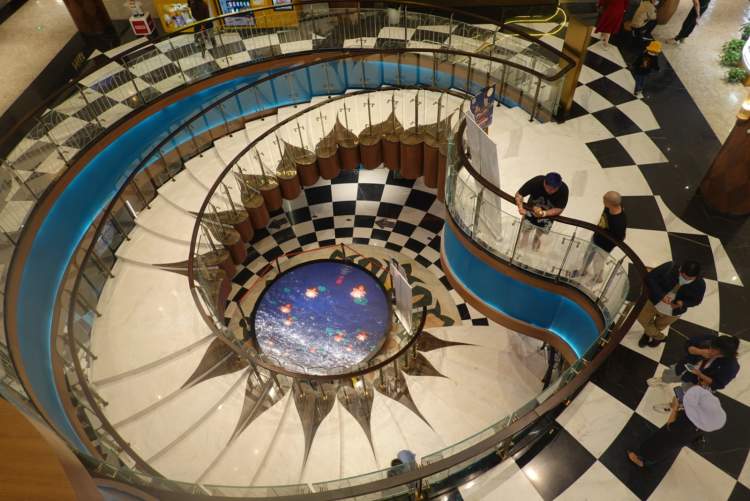 漫咖的选址在豫园商场天裕楼——这家商场在去年刚刚整修完毕,引进了大白兔、光明悠焙等老字号门店,Art Deco的风格既复古又时髦,位于中庭的旋转楼梯更是“弹眼落睛”。