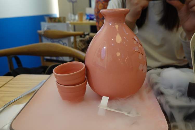 比方说,这一款“去年桃花”用的是粉红色的酒瓶和酒杯,端上来的时候还有烟雾效果。它对应的是游戏中的“桃花泪”——在桃花坑里种下桃花树苗,收获桃花泪,和桃花实、桃花诞、桃花衣一起合成桃花仙露。鉴于有的人不能或不便摄入酒精,可选含酒精的桃花酒,也可选无酒精的混合桃子汽水,周到君实测味道不错。