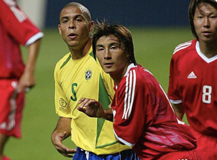 2002年世界杯对阵巴西的比赛中,肇俊哲的射门曾经击中门柱,是中国男足距离世界杯第一球最近的一次。