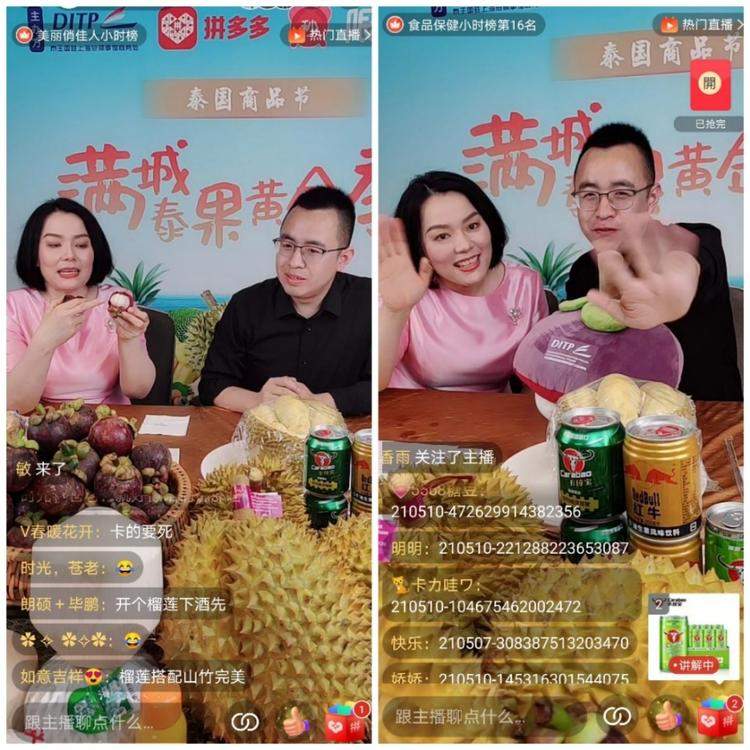 早在2019年9月,泰国进口水果首次登陆拼多多“秒杀万人团”,泰国进口的青皮金枕榴莲、原装进口茉莉香米当日上线即告售罄。去年6月,泰王国驻沪总领事馆商务处就初步尝试通过拼多多直播间,为广大网友推荐泰国进口水果以及本土美妆等产品。