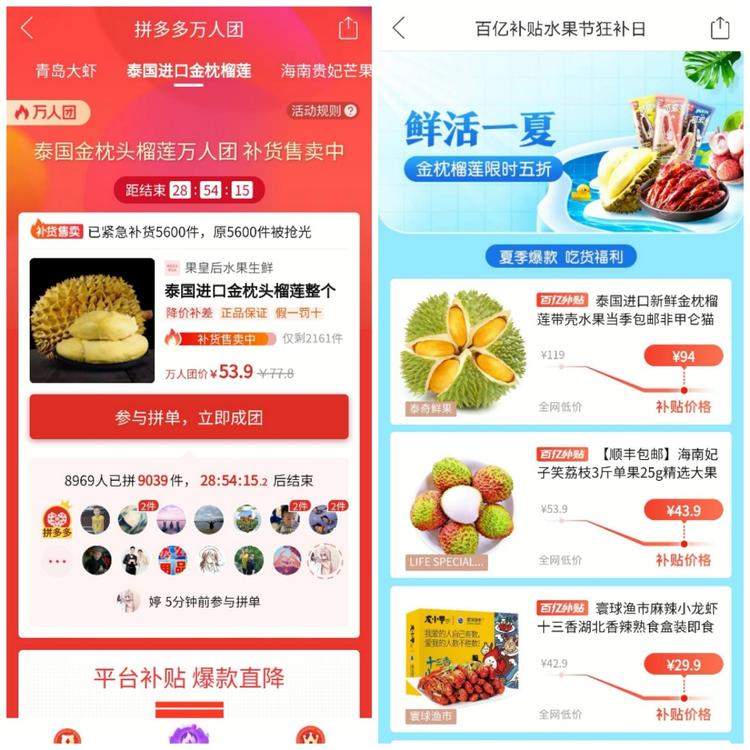 与此同时,拼多多百亿补贴、限时秒杀以及万人团频道也同步上线了泰国产品。其中,在当天的“泰国金枕榴莲万人团”中,5600件榴莲甫一上线即被秒杀。在紧急补货之后,截至当晚20:00左右,已累计售出超过9000件,共18吨新鲜榴莲。