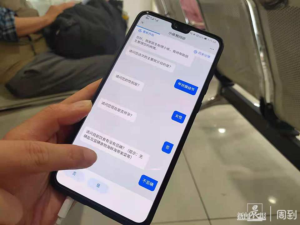 在候诊时,患者刘女士通过瑞金医院微信公众号进入了“智能预问诊”系统,并一一回答了“小依”的问题。