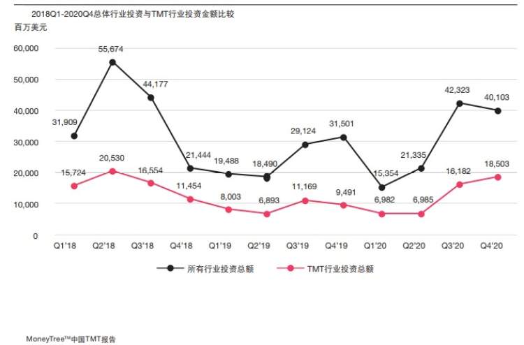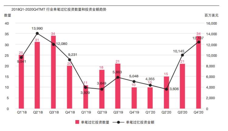 随着宏观经济逐渐恢复、中国内地资本市场活跃度持续提升,2020年下半年私募及创投(PE/VC)在科技、媒体及通信(TMT)行业的投资大幅度反弹,投资金额创2018年下半年以来新高。下半年TMT行业的投资数量共2063起,已披露投资金额的TMT行业投资金额为346.85亿美元,环比上升148%。大额交易的明星项目大量出现,单笔过亿投资的数量共55起,环比上升120%。