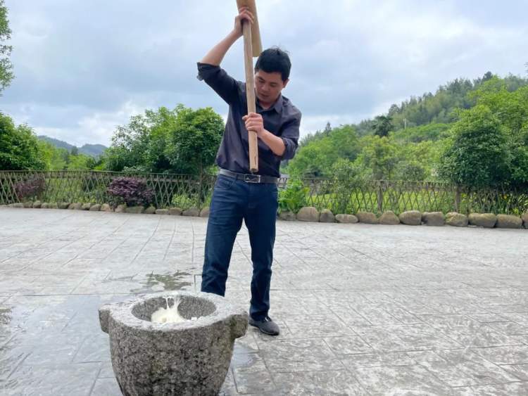 新打的糍粑裹上自家调制的料粉,变得色泽金黄,入手时还温热着,咬一口软、糯、香,还有一层特别的辣。
