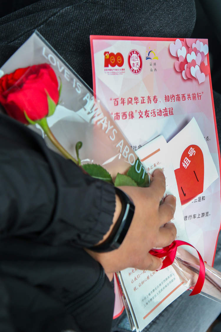 南西街道为前来的每位女嘉宾准备一朵玫瑰花,由抽签配对的男嘉宾亲手送出。