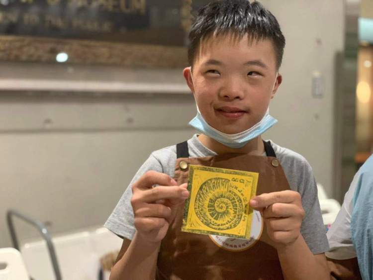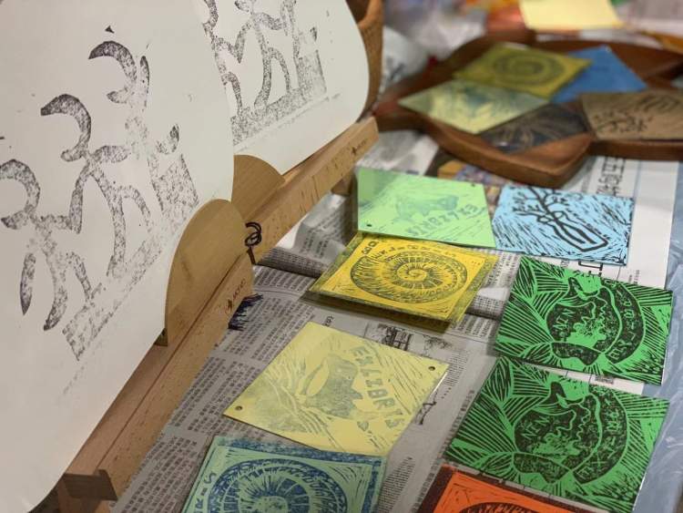 他们提前来馆参观,学习标本,选择自己最喜欢的标本画下来,并版刻下来,评选最好的十几种作品到现场拓印成鹦鹉螺、鸟类等图案的藏书票,免费地分发给现场的观众,也受到现场观众的喜爱。
