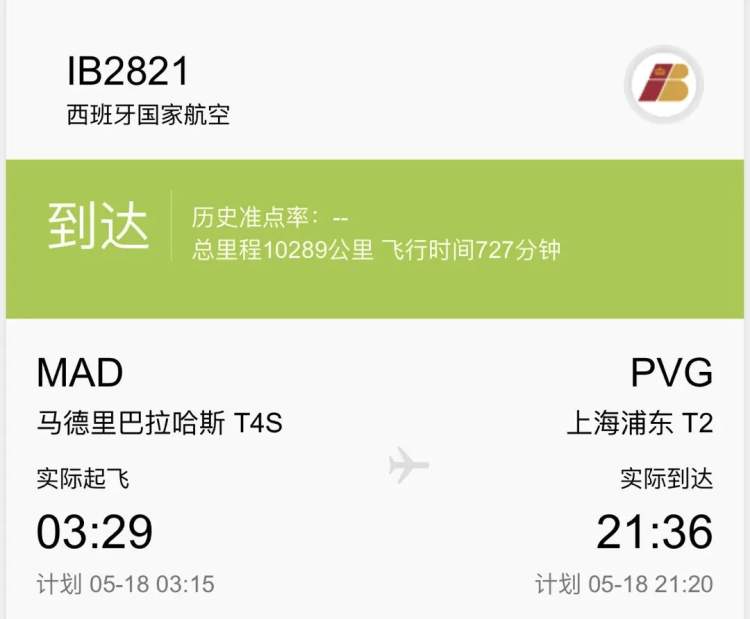 西班牙当地时间5月18日凌晨3点多,武磊从马德里出发,乘坐西班牙国家航空IB2821航班,于北京时间昨晚抵达上海浦东国际机场。在接受了相关入境防疫检测之后,武磊在上海的隔离酒店等待检查结果。