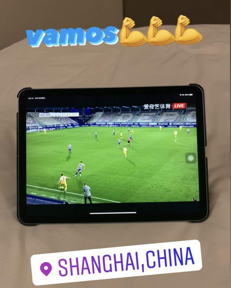 在酒店隔离期间正好有一场西乙第40轮西班牙人的比赛,将缺席球队本赛季最后三轮的武磊通过收看直播为俱乐部队友们加油,还在社交媒体上发了一张在酒店看球的照片。