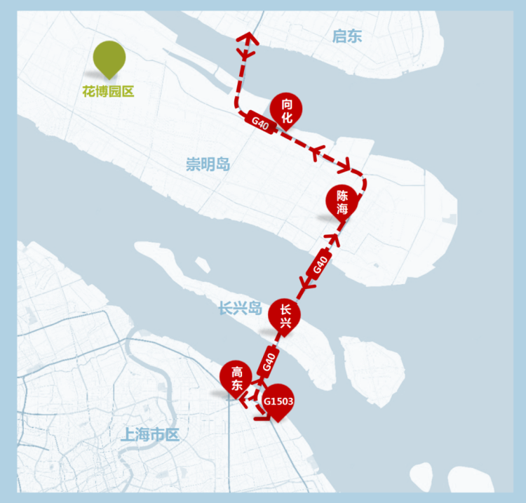 🌹岛内花博公交线路。崇明岛内也调整和新辟了7条花博公交线和2条花博旅游专线,分别连接了南门、新河、堡镇、陈家镇、长兴、西沙湿地和瀛东村等主要客流集散点。