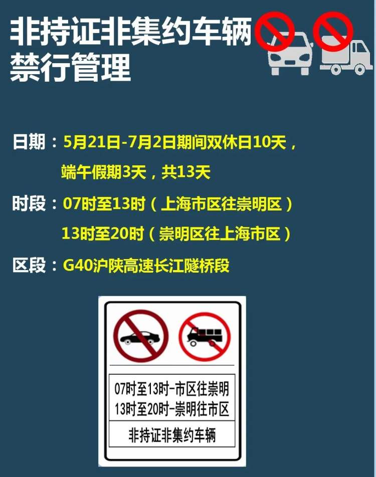 三、5月21日至7月2日期间的双休日、端午假期(双休日10天及6月12日至6月14日,共13天),每日7时至13时,G40沪陕高速禁止上海市区往崇明区(含崇明岛、长兴岛、横沙岛)的小客车、载货汽车等非集约车辆通行;每日13时至20时,G40沪陕高速禁止崇明区(含崇明岛、长兴岛、横沙岛)往上海市区的小客车、载货汽车等非集约车辆通行(执行公务的警车、消防车、救护车、工程抢险车以及持有公安机关核发的有效通行证件或预约停车证的车辆除外)。