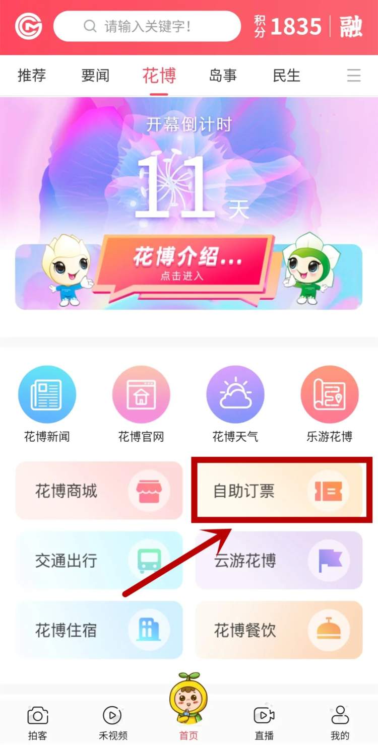 2、在“花博”专栏中找到“自助订票”,点击进入“票务”系统进行购票。