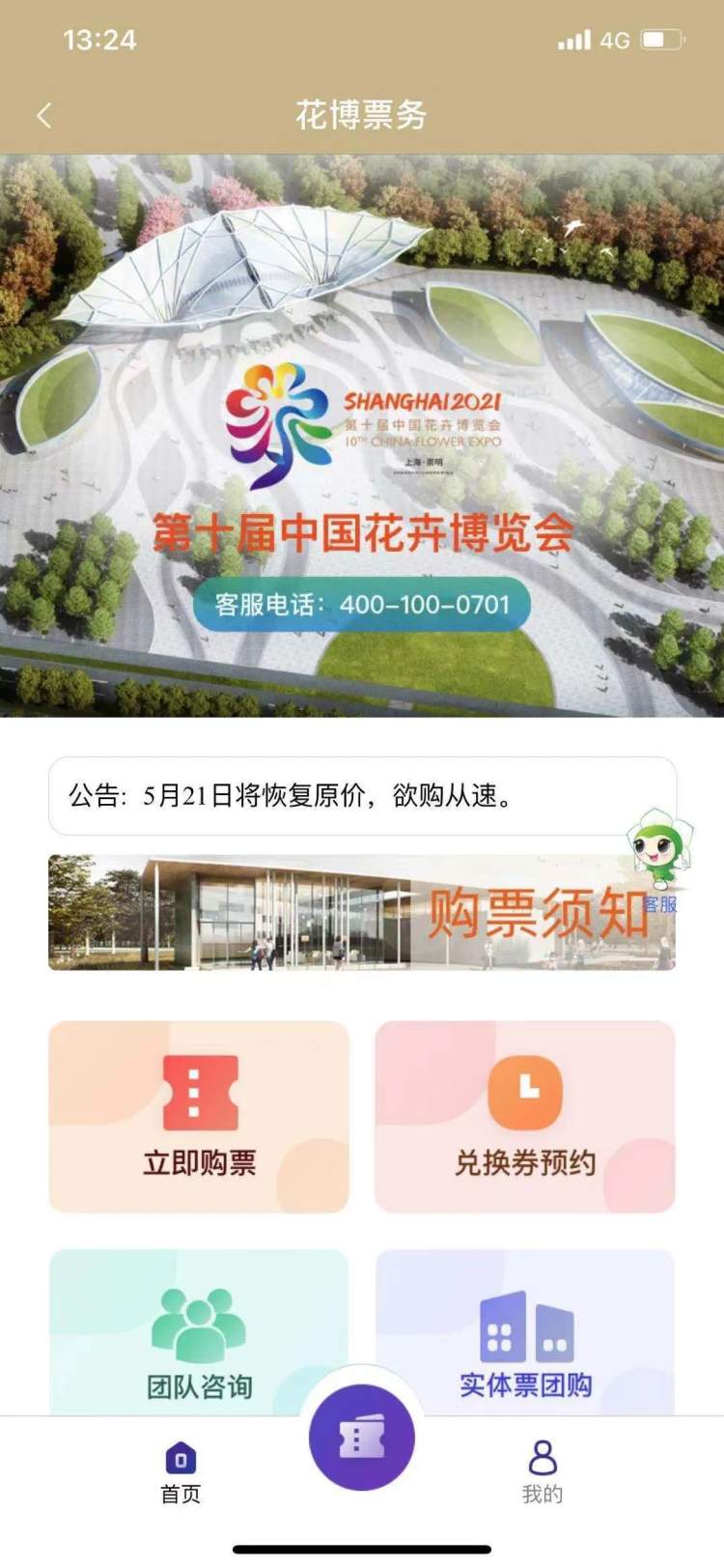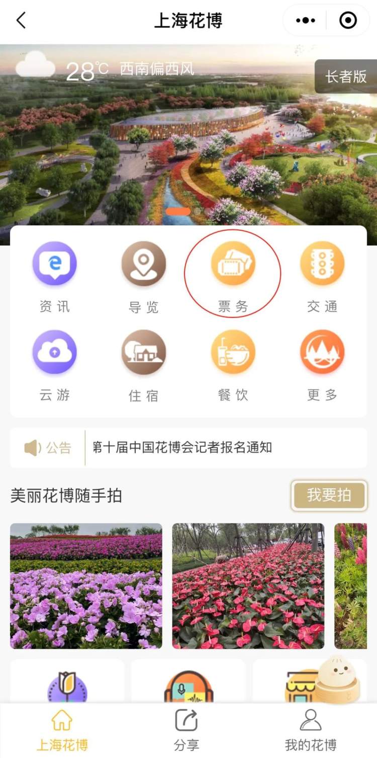 认证后进入“上海花博”页面后,点击“票务”按钮,可在线“实名制”购买花博会门票,并至少提前一天预约入园日期。