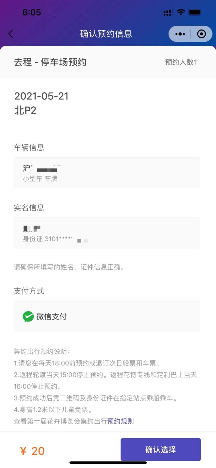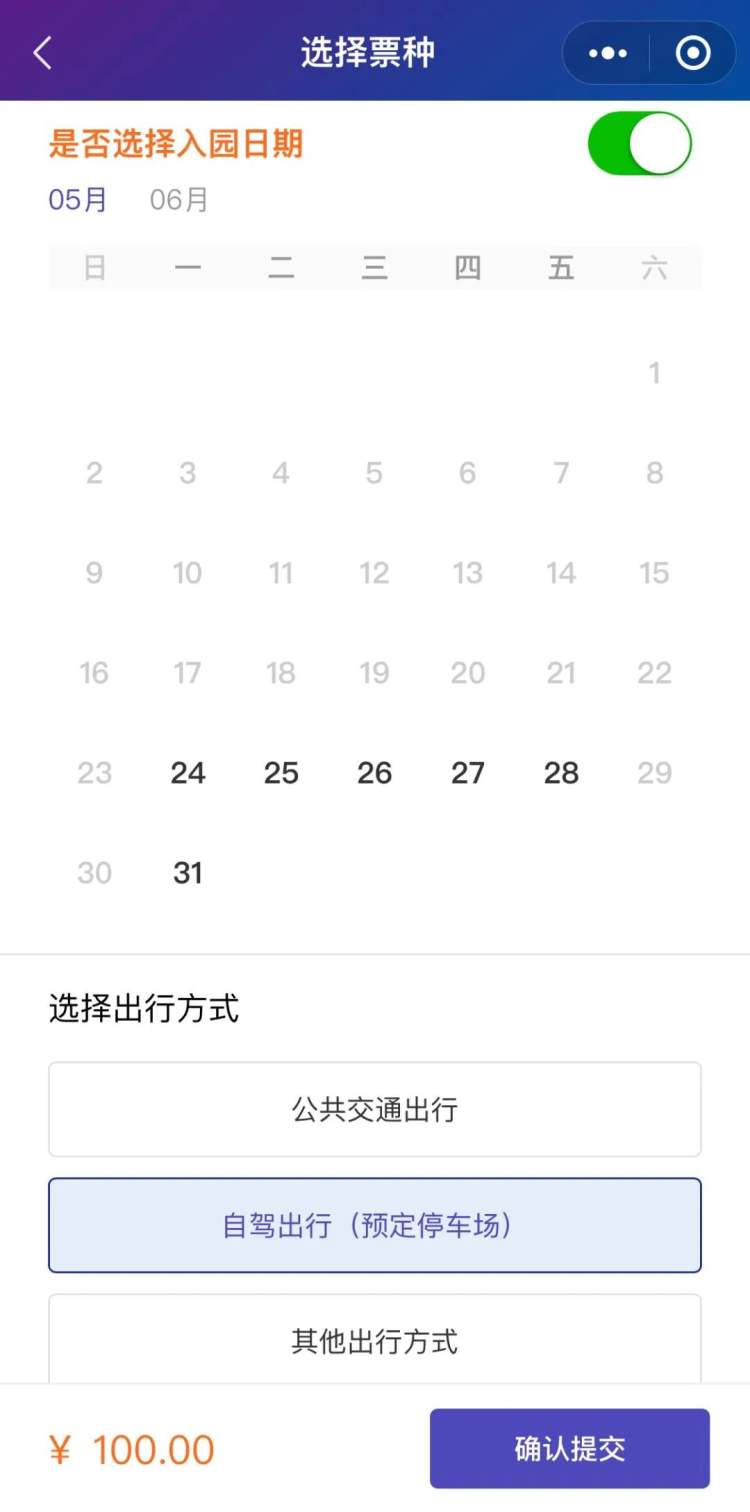 确认参观人信息后,可选择入园日期及出行方式,阅读并同意购票须知,完成付款。
