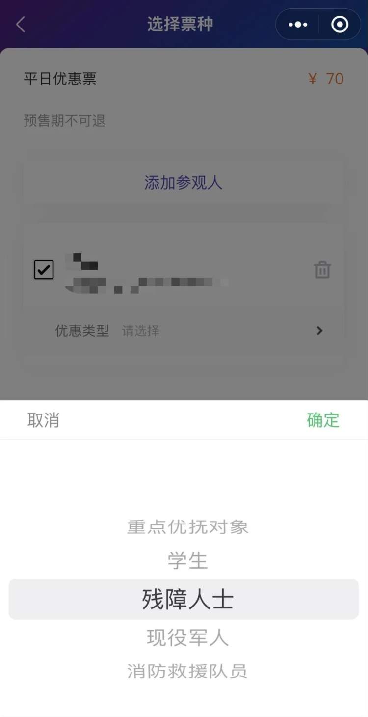 符合优惠条件的市民,可勾选“我符合优惠条件”,在完善参观人信息时选择优惠类型。