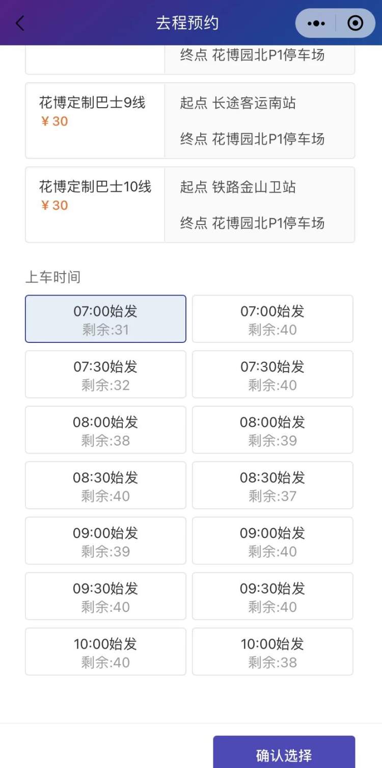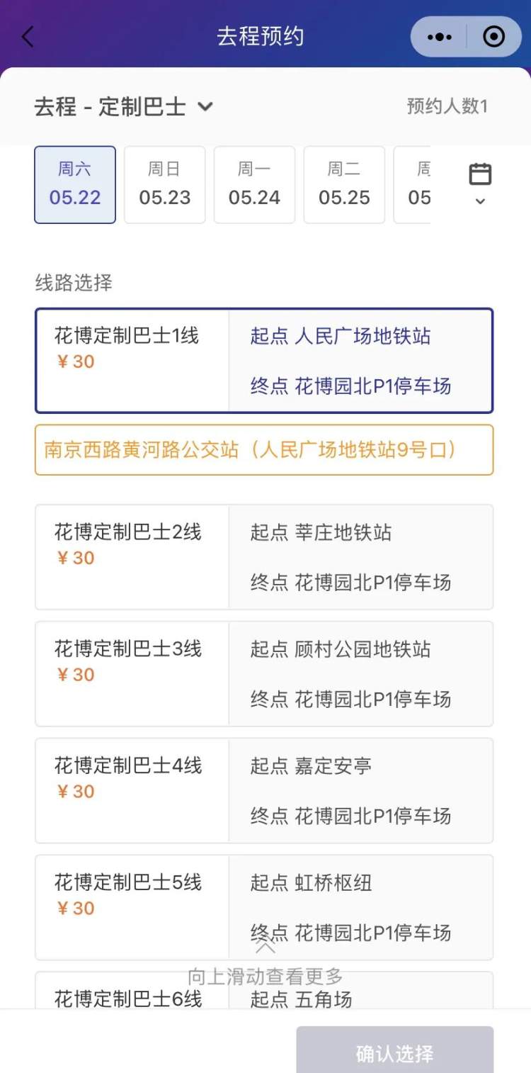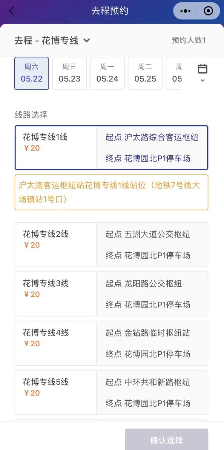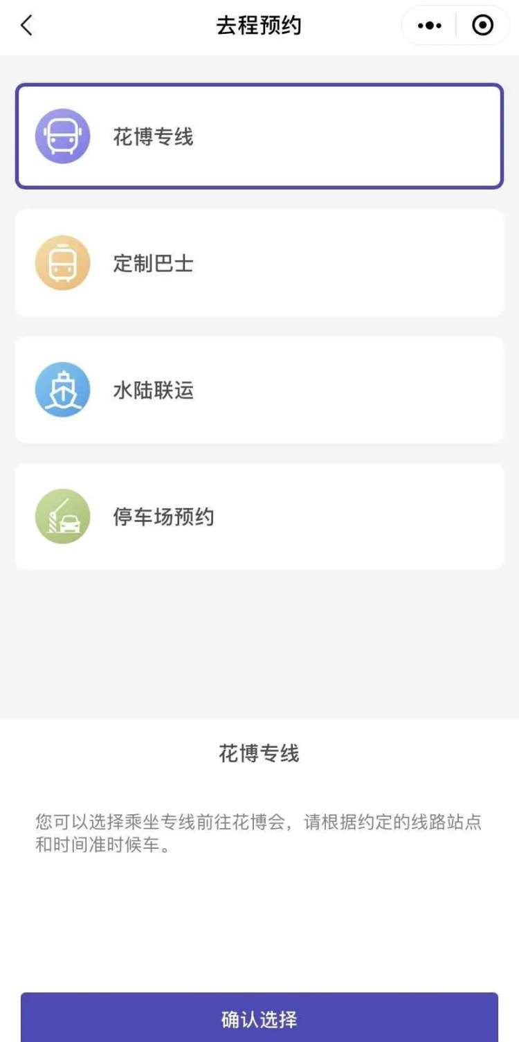 在“花博交通”系统中,点击去程预约,选择花博专线并确认。