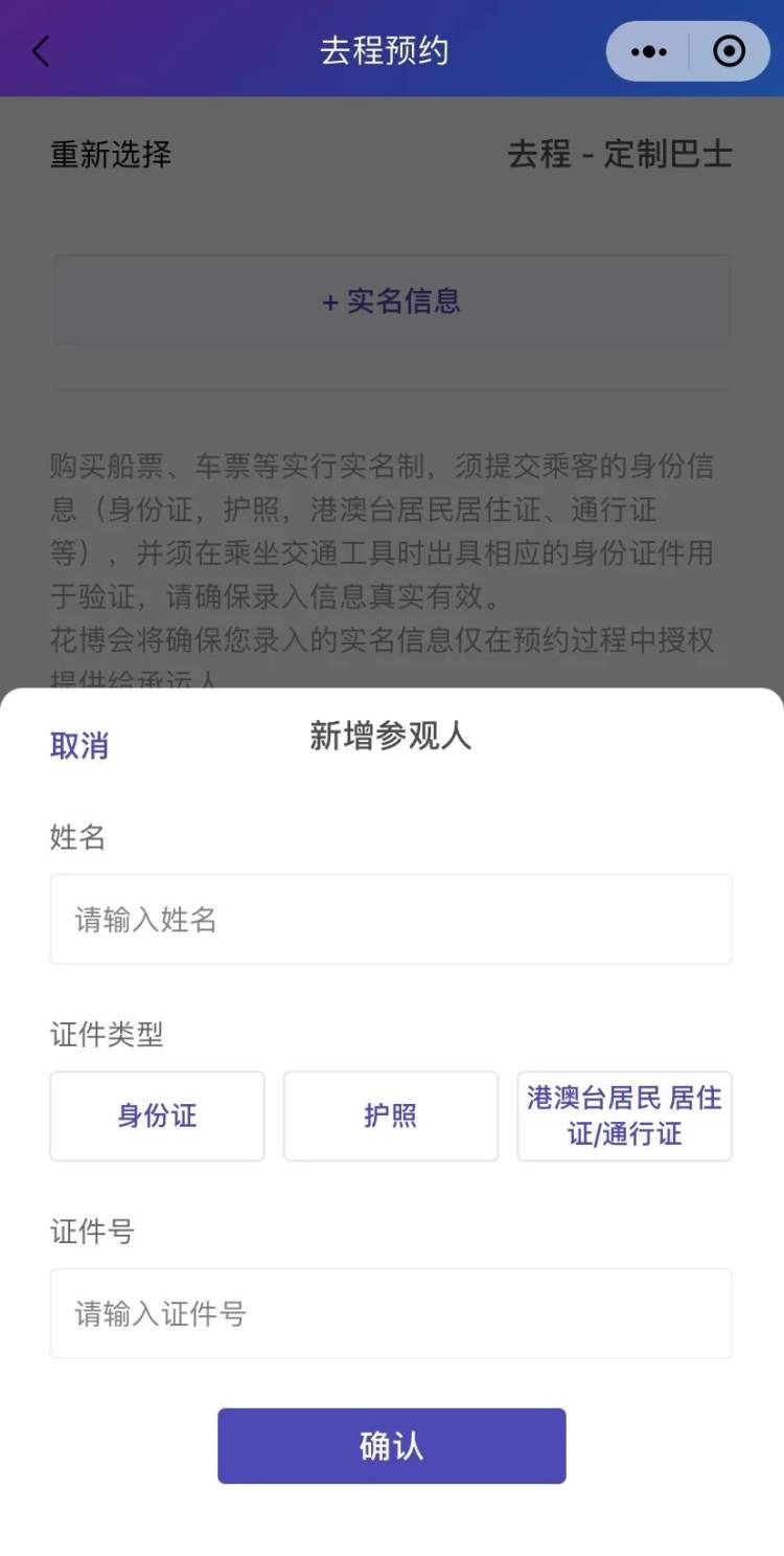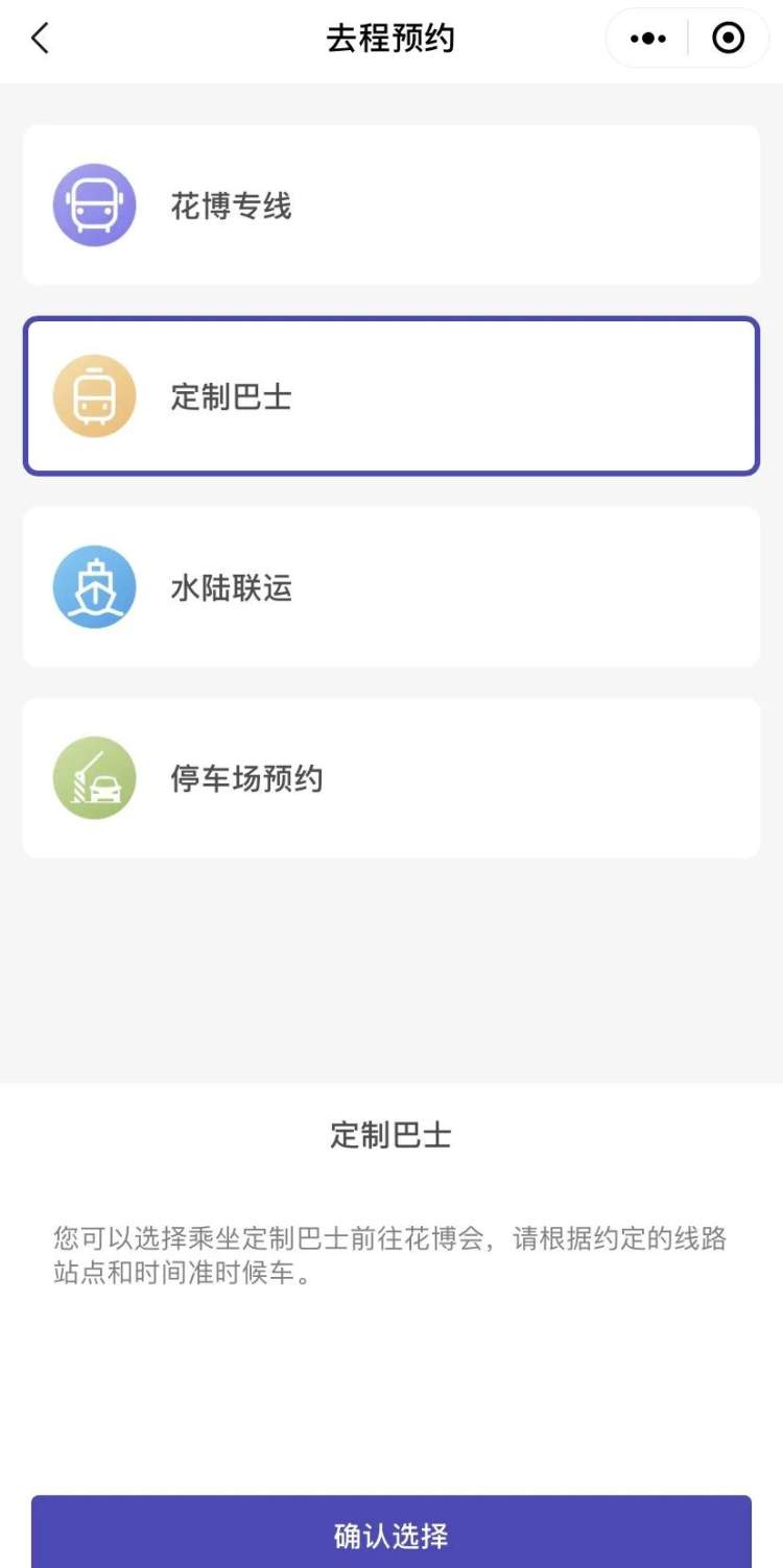 在“花博交通”系统中,点击去程预约,选择定制巴士并确认。