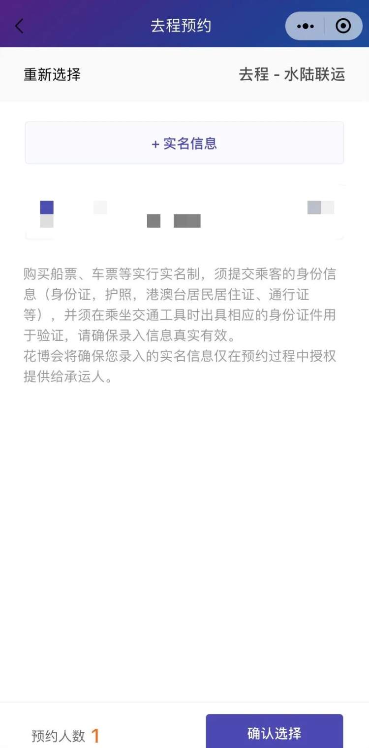 在“花博交通”系统中,点击去程预约,选择水陆联运并确认。