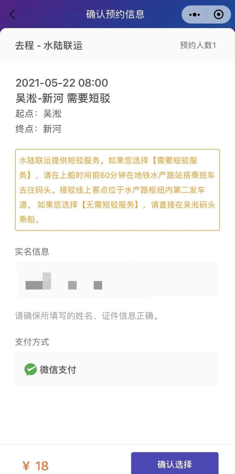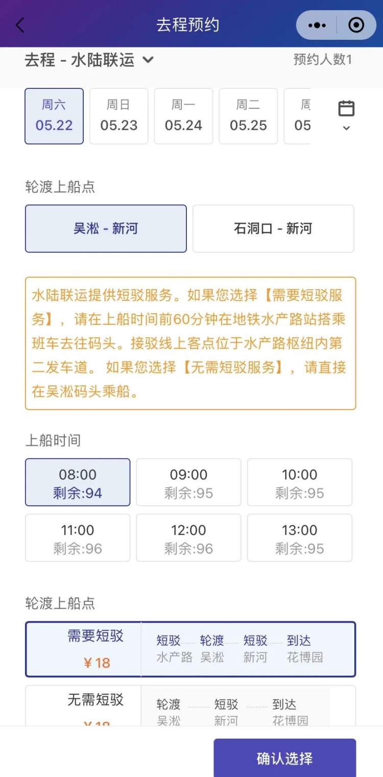 选择观展日期、轮渡上船点、上船时间、是否需要短驳并确认,核对相应信息后,即可支付。