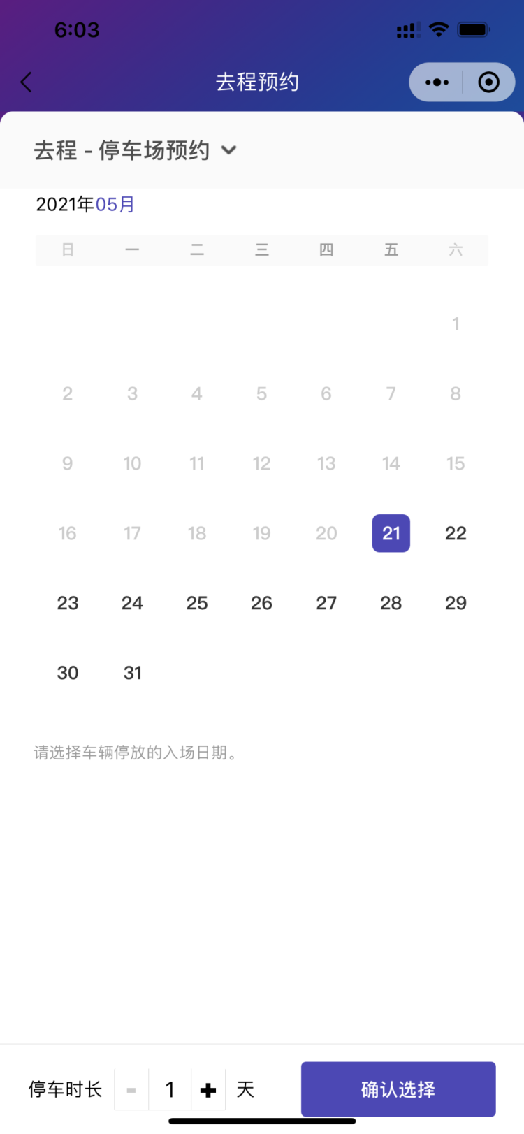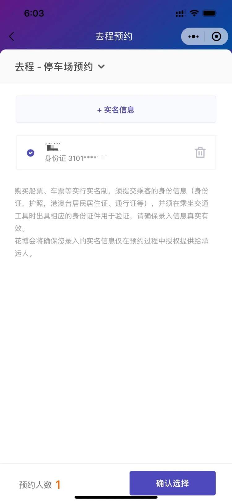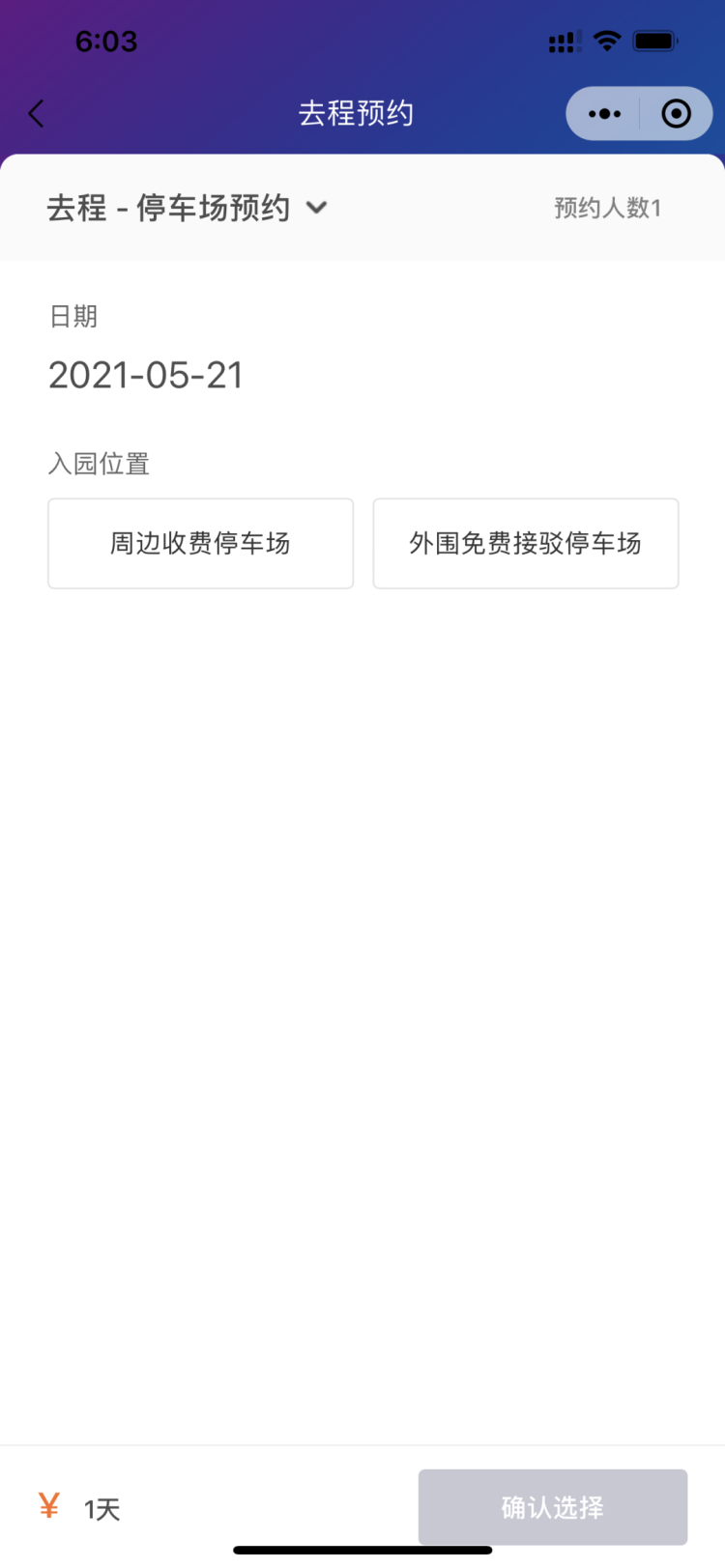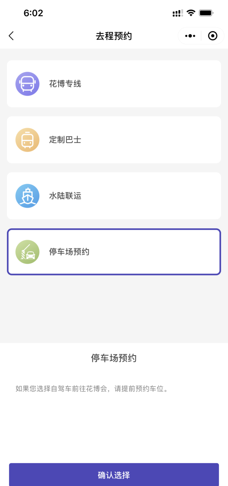 在“花博交通”系统中,点击去程预约,选择停车场预约。