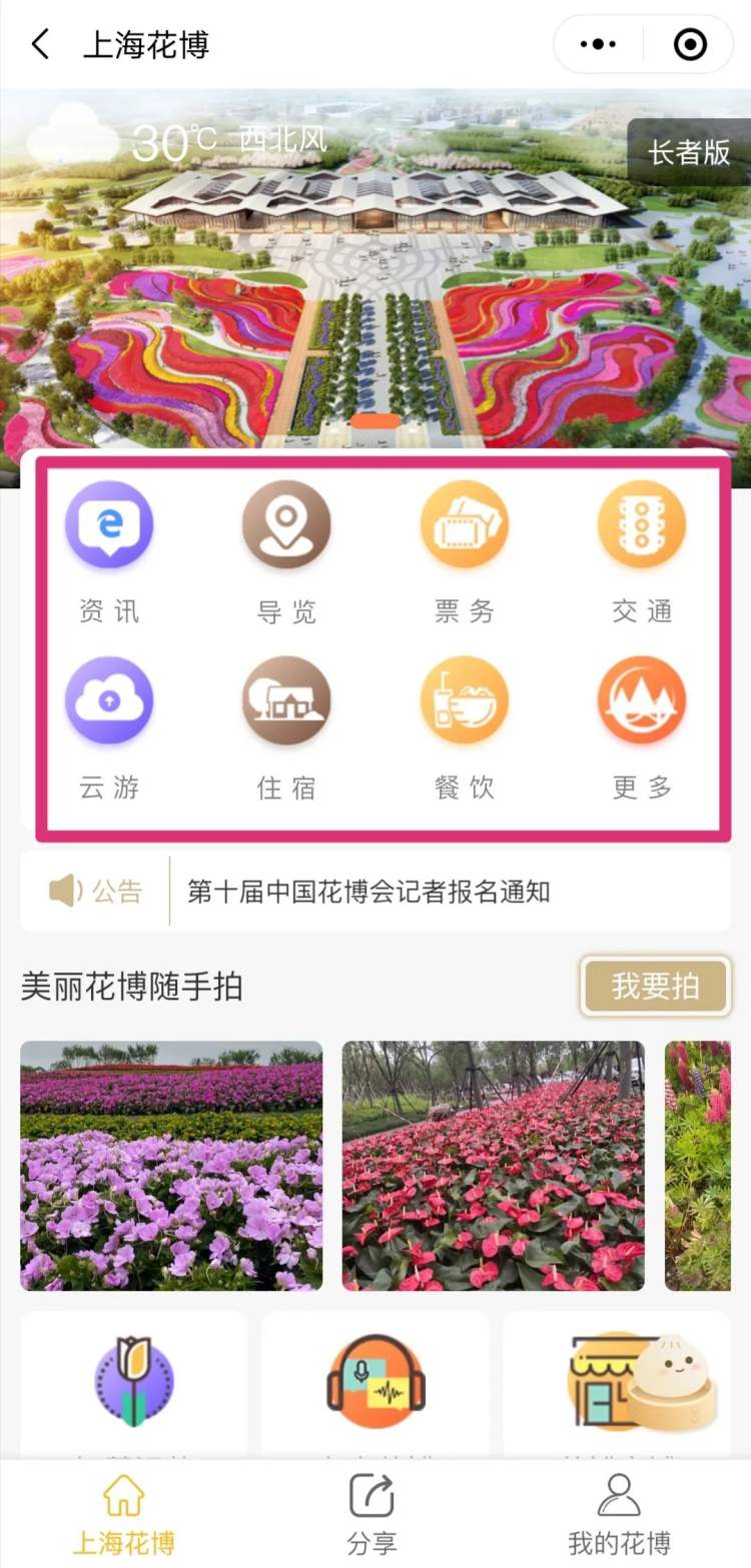 如果想在崇明住宿一晚,慢慢领略花博园及崇明美景,“上海花博”页面也有预定崇明住宿等功能;如果没有时间逛花博园,还可以在网上“云游花博”。来看看“上海花博”页面的8大功能按钮,获取相应服务。