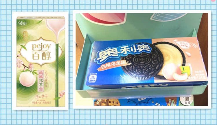 觉得蛋糕、面包或许太瓷实了?那就来点小零食吧。pocky的桃桃抹茶、奥利奥的白桃乌龙都在便利店上架了。