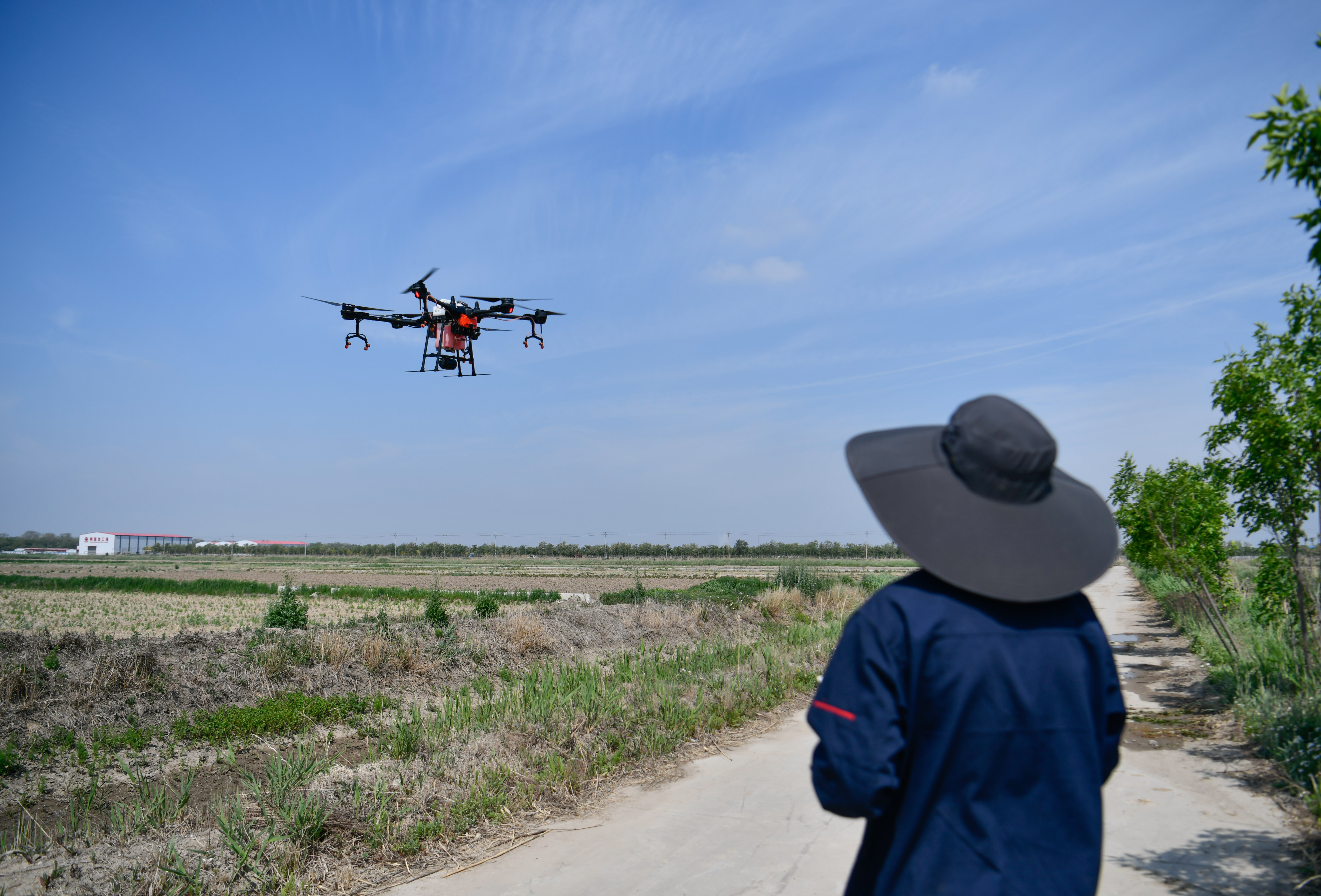 ↑在天津市西青区王稳庄镇,植保无人机进行除草剂喷洒作业(5月11日摄)。新华社发(孙凡越摄)