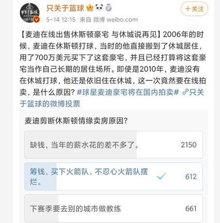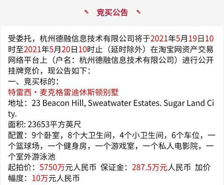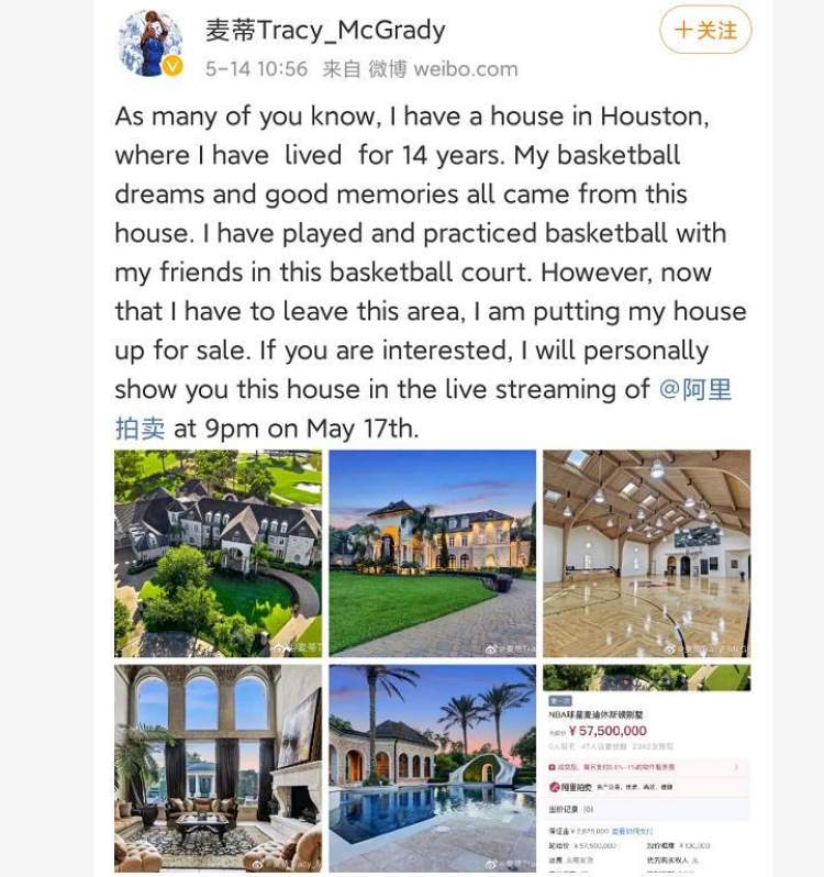 5月14日,麦迪在微博个人账号上宣布要把自己在休斯顿的房子卖掉,在阿里拍卖上卖,起拍价5750万元人民币,23653平方英尺,带篮球场、室外游泳池的豪宅。