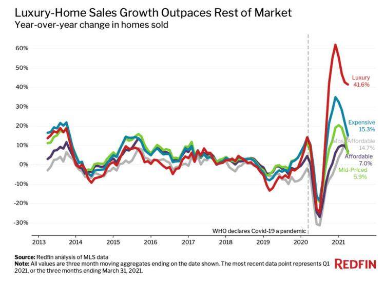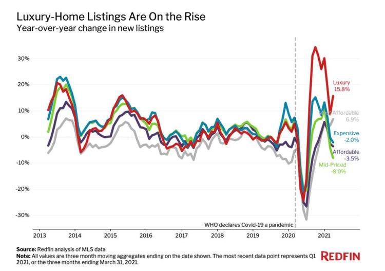 同时,豪宅供应数量在增加。2021年第一季度,新挂牌的豪宅数量增长了15.8%,而其他类型不增反降。