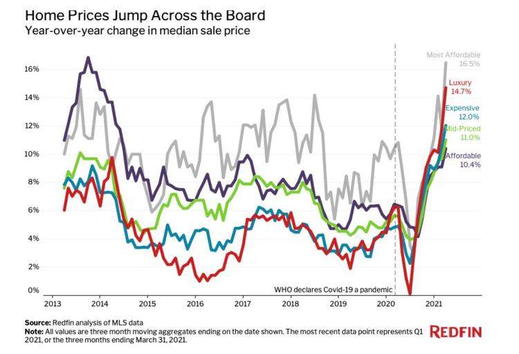 从去年下半年,美国房市就开始逆周期大卖。今年第一季度,豪宅销售量增加了41.6%,远超可负担住房(Affordable-Home,可理解为经济适用房)、廉价房(Most Affordable Home)等其他类型的住宅。