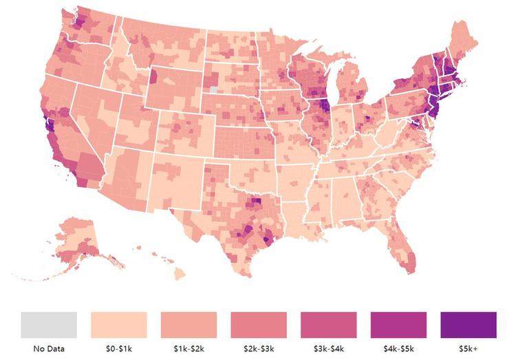 ■哪个地方交了最多的房产税(计算方式:房产税中位数),颜色越深房产税中位数越高。可以看到科比旧宅所在的加州和麦迪房产所在的休斯顿,颜色都较深
