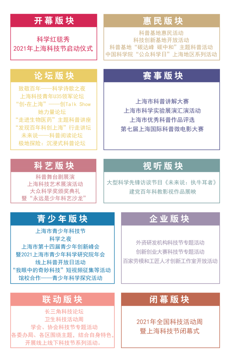据悉,2021年上海科技节以“百年回望 崇尚科学 自立自强”为主题,分为开幕板块、惠民板块、论坛板块、赛事板块、科艺板块、视听板块、青少年板块、企业板块、联动板块、闭幕板块共10板块。