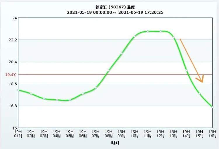 伴随着雨水,申城午后气温明显下降,徐家汇站从最高的23℃直接跌到16℃左右,下班时段体感凉飕飕的。