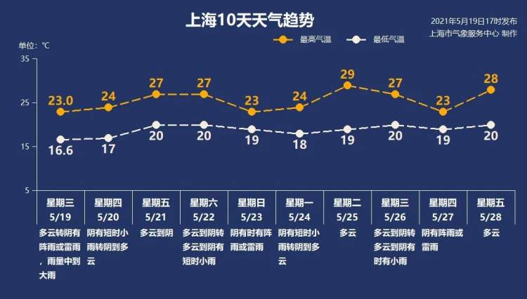 周日及下周一气温又有所回落,下周二的最高气温则再次攀高到接近30℃,之后再逐渐回落。
