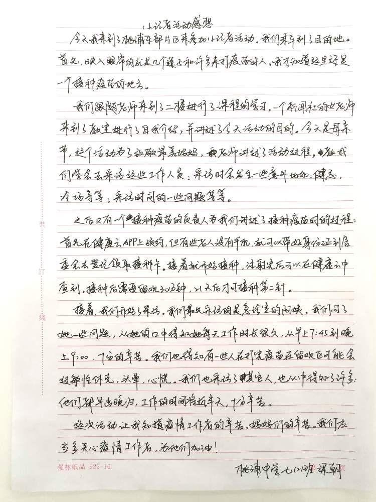她们要一天为市民接种两千余针,有点时候还会遇到难以处理的事、不听医护人员话的人,有时老人打好针后非常紧张,不停地抱怨。这时,她们也许会有些烦躁,但依旧静心地安慰他们。——民办彭浦实验小学 四年级 龚逸辰
