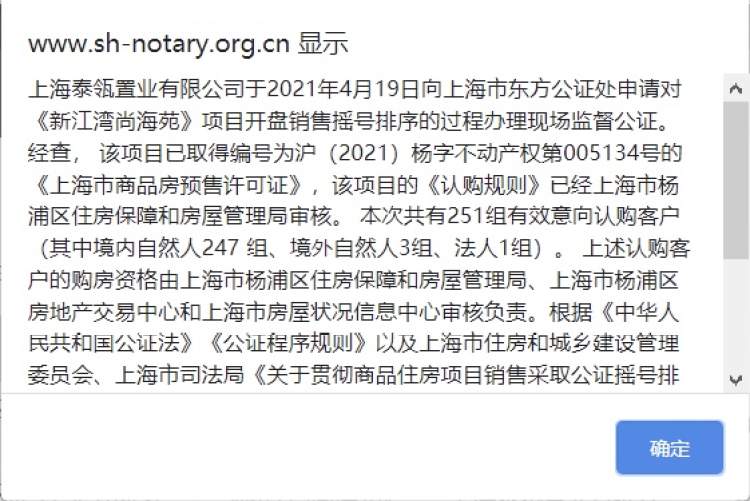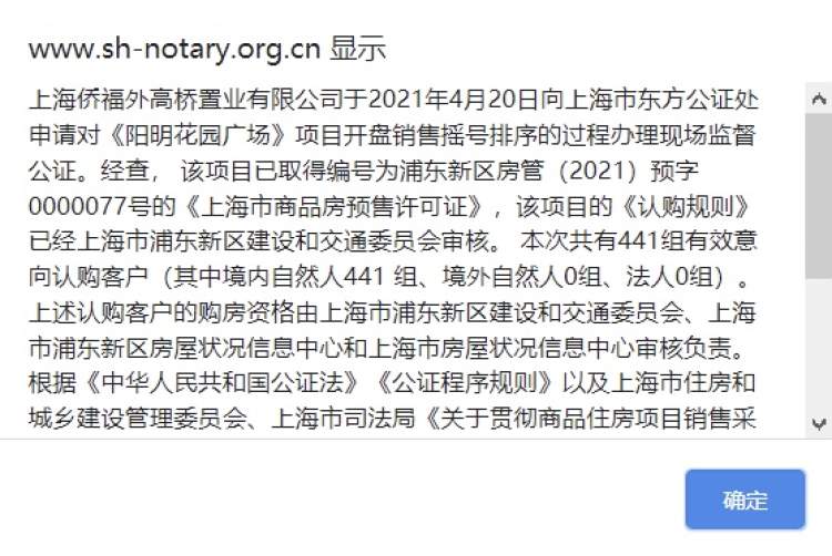 根据上海市东方公证处网站摇号公正法律服务公开信息,阳明花园336套房源441组认购人入围,认购率131.25%,达到积分摇号条件;上海院子209套房源251组认购,认购率120.1%,未触发积分摇号,所有认购人可以不经积分审核直接参与摇号开盘。