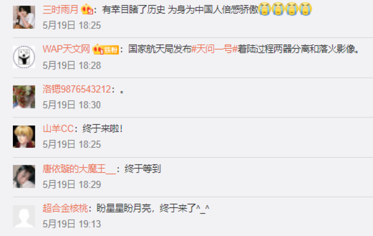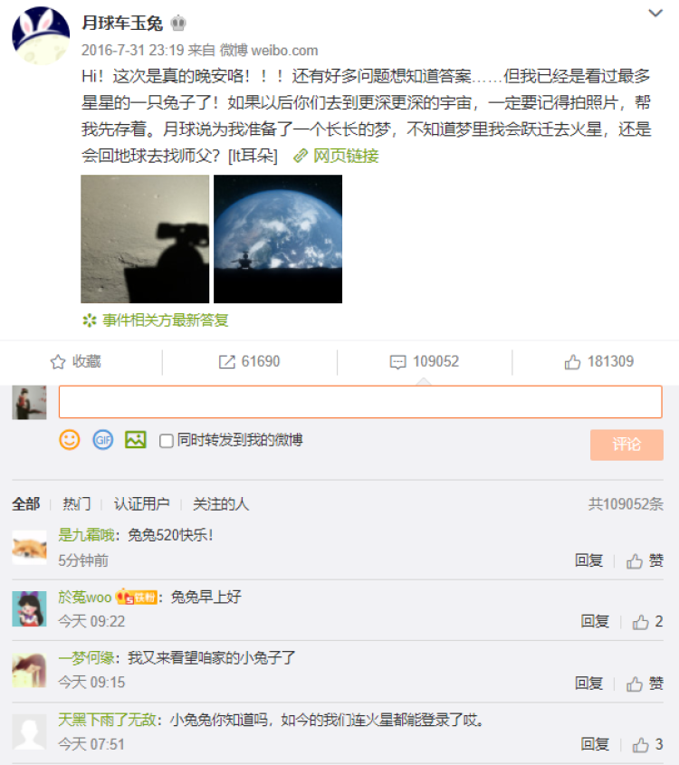 ↑“小兔兔你知道吗,如今我们连火星都能登陆了哎。”至今,还有网友会到“玉兔号”月球车微博下留言