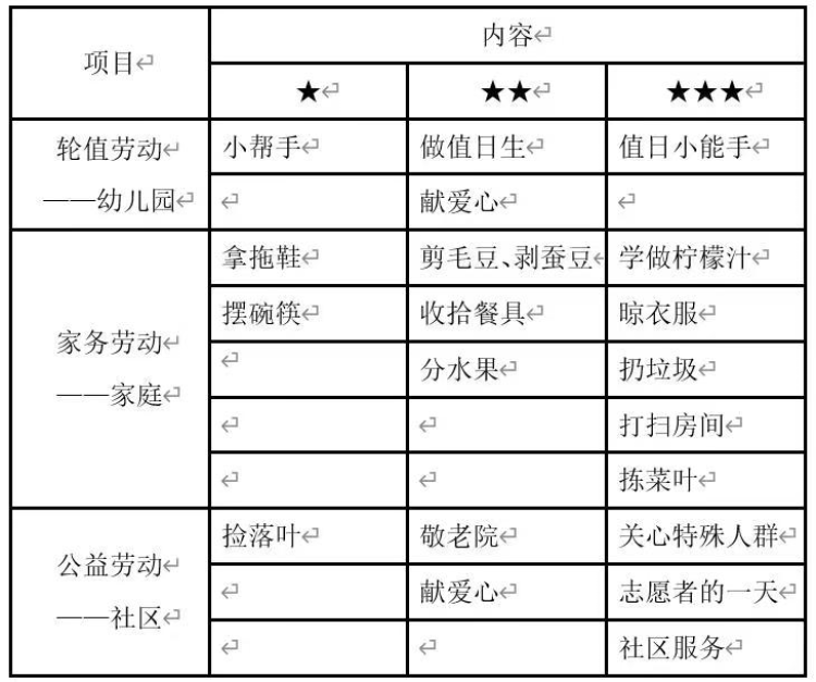 值得一提的是,有别于传统的分年龄段开展教育教学,此次劳动教育课程根据劳动项目的难易程度进行划分层次。例如,一颗星难度有自己穿衣服等项目,两颗星难度有帮忙拣菜、剥蚕豆等,三颗星则是一些社会服务性劳动。