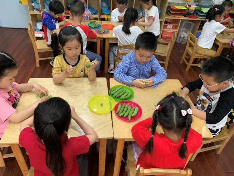 以浦东新区幼儿园劳动教育课程模块“集体事情大家做”之家务劳动“剥蚕豆”为例来说,帮助家人一起做家务本身就是德育教育的体现;通过剥豆认识蔬菜,知道豆壳是不能吃的,对孩子来说是新的认知,是智育的体现;剥蚕豆的过程是促进手指小肌肉的发展,能培养注意力、坚持性,是体育的体现;烹饪后品尝到自己的劳动成果既干净又整齐,是美育的体现。