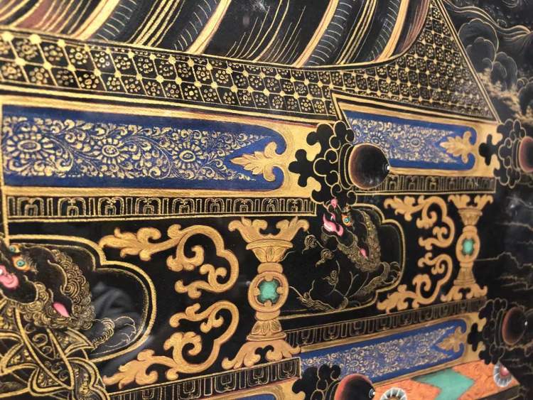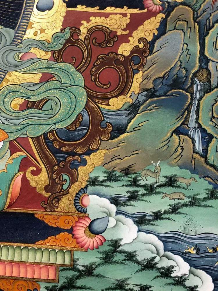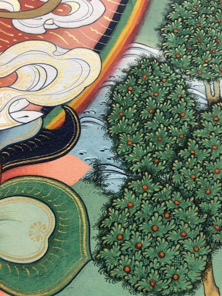 作为首批国家级非物质文化遗产的唐卡,其绘制的颜料和描金传统上采用了珍贵的矿物宝石以及藏红花等植物,加之其绘制重要环节的描金必须使用由大量金箔和金片制成的金汁,因此尽管历经几百乃至上千年,唐卡画面依然是金碧辉煌,灿烂如新。由此也赋予了艺术瑰宝的唐卡有着难以言表的魅力。